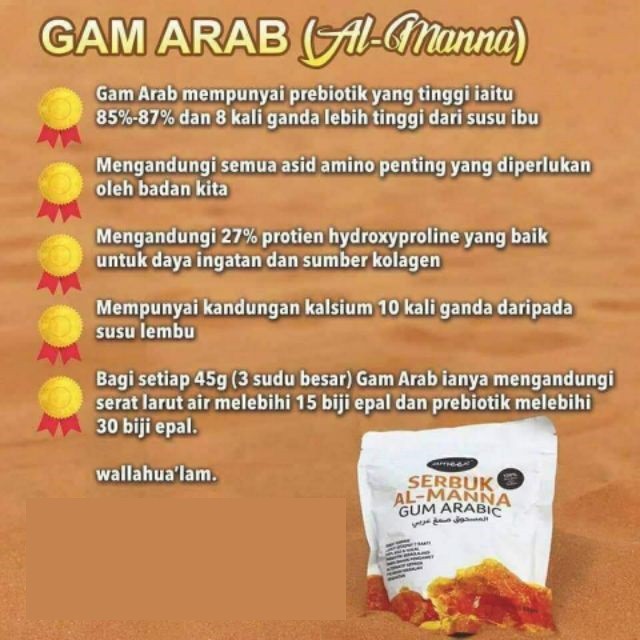 Gam atau Al-Manna yang saya jual adalah dari jenis Acacia Senegal gred 1 dalam bentuk serbuk powder iaitu serbuk Gum Arabic Gred 1 yang terbaik dan terpilih ia diimport dari Sudan 100 Gum Arabic asli tanpa bahan pengawet dan apa-apabahan campuran. Arabic Gum tiada kesan sampingan. Gam Arab telah dibuktikan melalui banyak kajian bahawa pengambilan gam Arab yang berterusan memberi banyak manfaat kepada kesihatan.